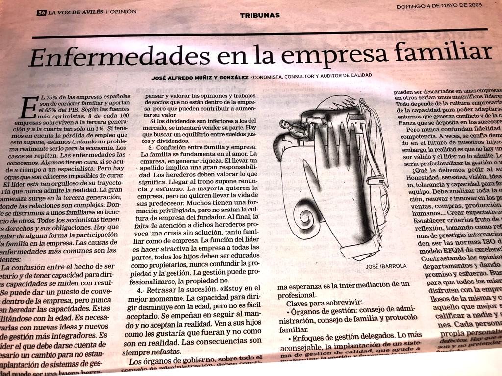 El artículo de la hemeroteca de La Voz de Avilés se titula “Enfermedades en la empresa familiar”. Por aquel entonces yo era profesor como economista y auditor en un master sobre el asunto y fui el consultor nombrado por la Cámara de Comercio de Avilés para guiar en el protocolo familiar a más de 20 empresas familiares en Avilés y comarca. Además impartí un curso de formación sobre el asunto, terminamos las clases con la proyección de la película La Herencia, y luego dirigí tutorías personalizadas.